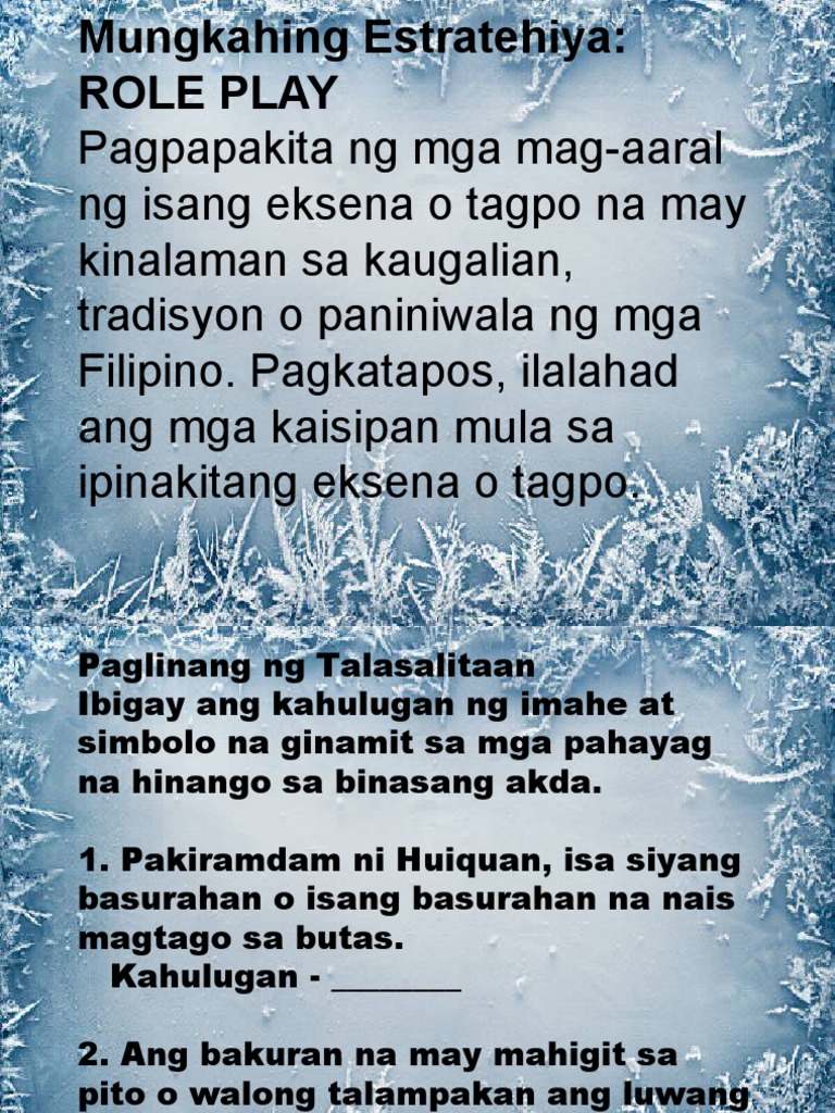 Zafra Paparating na ang bisperas ng Bagong Taon. Ilarawan ang lugar na kinabibilangan ni Huiquan at ang kanyang kilosgawi at paniniwala. Pakiramdam ni huquan ay isa siyang basurahan o isang pirasong basahan na nais magtago sa butas 4.